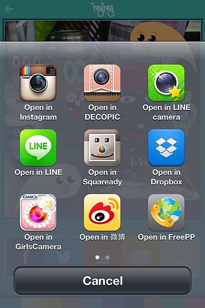 你可以選擇上傳fb,Twitter,收到相簿,寄出,或是最後一個最棒的你還可以拉到其它程式再做修圖